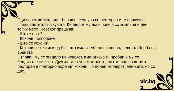 Отпрвин му се згадило на човекот, ама откако ги пробал и му се бендисале се изел. Другиот ден човекот повторно отишол во истиот ресторан и повторно порачал кохони. Го донел келнерот јадењето, но со две топки скоро двојно помали од претходните. Човекот револтиран: