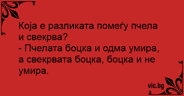 - Пчелата боцка и одма умира, а свекрвата боцка, боцка и не умира.