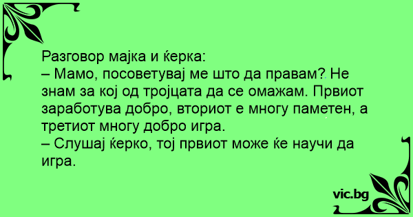 – Мамо, посоветувај ме што да правам? Не знам за кој од тројцата да се омажам. Првиот заработува добро, вториот е многу паметен, а третиот многу добро игра.