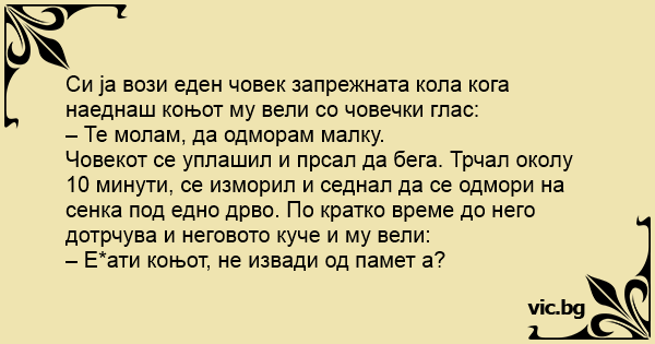 Си ја вози еден човек запрежната кола кога наеднаш коњот му вели со човечки глас: