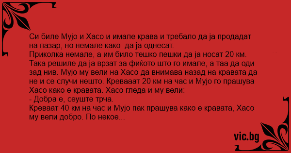 Си биле Мујо и Хасо и имале крава и требало да ја продадат на пазар, но немале како  да ја однесат.