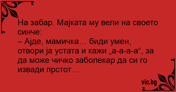 – Ајде, мамичка… биди умен, отвори ја устата и кажи „а-а-а-а“, за да може чичко заболекар да си го извади прстот…