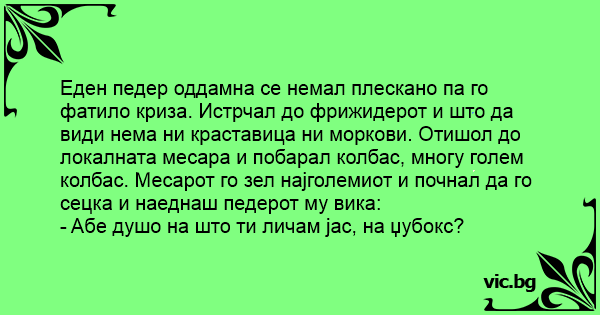 Еден педер оддамна се немал плескано па го фатило криза. Истрчал до фрижидерот и што да види нема ни краставица ни моркови. Отишол до локалната месара и побарал колбас, многу голем колбас. Месарот го зел најголемиот и почнал да го сецка и наеднаш педерот му вика:
