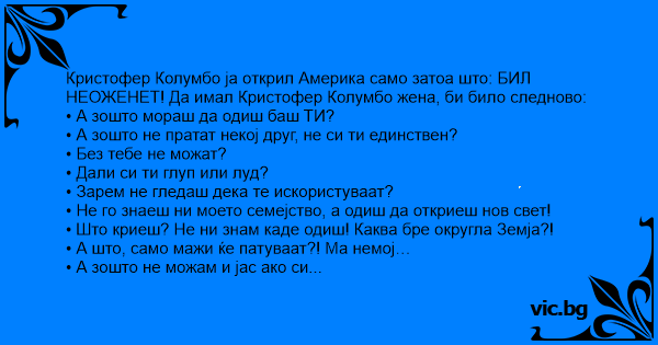Кристофер Колумбо ја открил Америка само затоа што: БИЛ НЕОЖЕНЕТ! Да имал Кристофер Колумбо жена, би било следново: