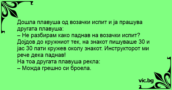 – Не разбирам како паднав на возачки испит? Дојдов до кружниот тек, на знакот пишуваше 30 и јас 30 пати кружев околу знакот. Инструкторот ми рече дека паднав!