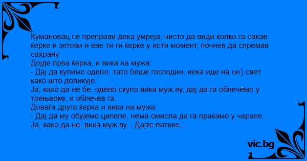 Кумановац се преправи дека умреја, чисто да види колко га сакав ќерке и зетови и еве ти ги ќерке у исти момент, почнев да спремав сахрану