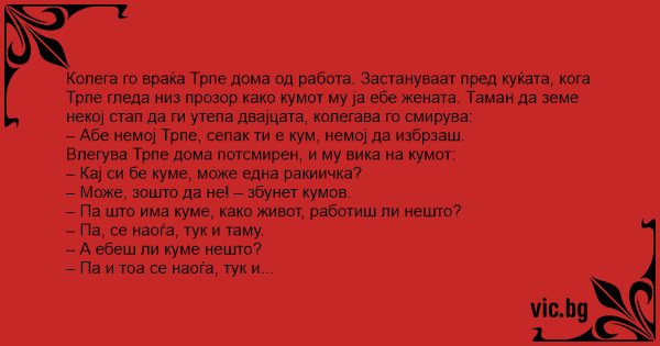 – Абе немој Трпе, сепак ти е кум, немој да избрзаш.