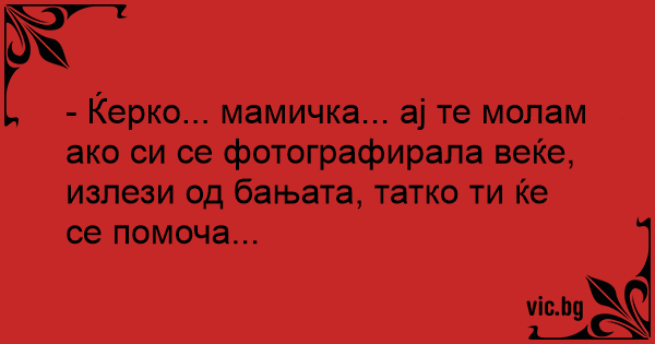 - Ќерко... мамичка... ај те молам ако си се фотографирала веќе, излези од бањата, татко ти ќе се помоча...