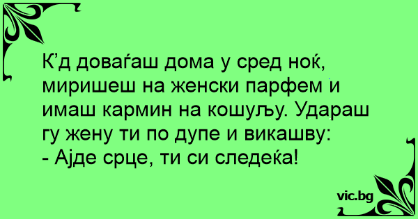 К’д доваѓаш дома у сред ноќ, миришеш на женски парфем и имаш кармин на кошуљу. Удараш гу жену ти по дупe и викашву: