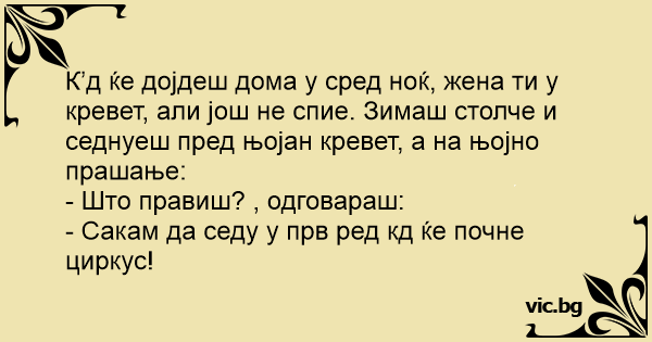 К’д ќе дојдеш дома у сред ноќ, жена ти у кревет, али још не спие. Зимаш столче и седнуеш пред њојан кревет, а на њојно прашање: