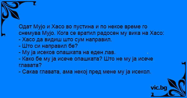 Одат Мујо и Хасо во пустина и по некое време го снемува Мујо. Кога се вратил радосен му вика на Хасо: - Хасо да видиш што сум направил. - Што си направил бе? - Му ја исеков опашката на еден лав. - Како бе му ја исече опашката? Што не му ја исече главата? - Сакав главата, ама некој пред мене му ја исекол.