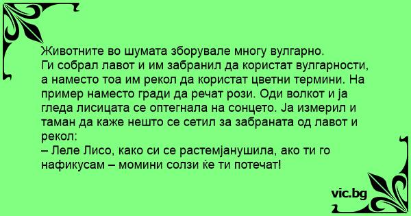 Ги собрал лавот и им забранил да користат вулгарности, а наместо тоа им рекол да користат цветни термини. На пример наместо гради да речат рози. Оди волкот и ја гледа лисицата се оптегнала на сонцето. Ја измерил и таман да каже нешто се сетил за забраната од лавот и рекол:
