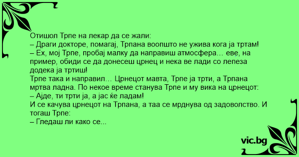 Отишол Трпе на лекар да се жали: – Драги докторе, помагај, Трпана воопшто не ужива кога ја тртам! – Ех, мој Трпе, пробај малку да направиш атмосфера… еве, на пример, обиди се да донесеш црнец и нека ве лади со лепеза додека ја тртиш! Трпе така и направил… Црнецот мавта, Трпе ја трти, а Трпана мртва ладна. По некое време станува Трпе и му вика на црнецот: – Ајде, ти трти ја, а јас ќе ладам! И се качува црнецот на Трпана, а таа се мрднува од задоволство. И тогаш Трпе: – Гледаш ли како се лади, пичka ти мајчина!