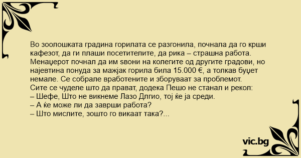 В зоопарка горилата се разгонила, започнала да троши клетката, да стряска посетителите да реве… страшна работа.