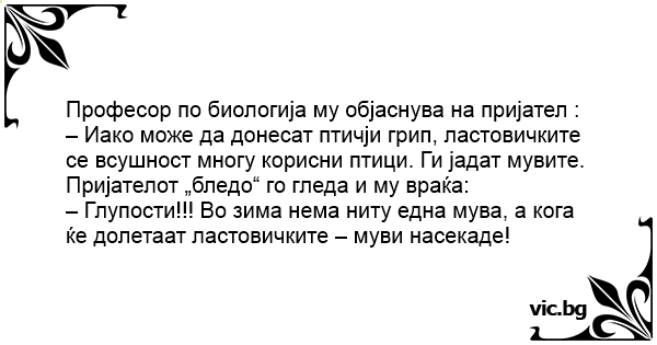 – Глупости!!! Во зима нема ниту една мува, а кога ќе долетаат ластовичките – муви насекаде!