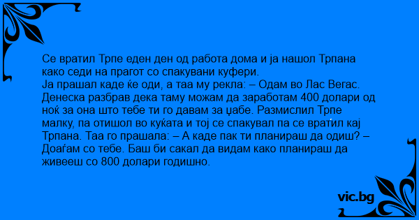 Ја прашал каде ќе оди, а таа му рекла: – Одам во Лас Вегас. Денеска разбрав дека таму можам да заработам 400 долари од ноќ за она што тебе ти го давам за џабе. Размислил Трпе малку, па отишол во куќата и тој се спакувал па се вратил кај Трпана. Таа го прашала: – А каде пак ти планираш да одиш? – Доаѓам со тебе. Баш би сакал да видам како планираш да живееш со 800 долари годишно.