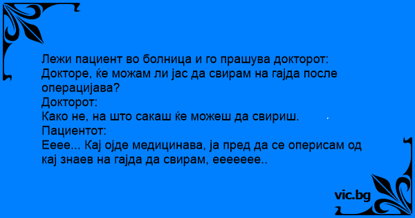 Лежи пациент во болница и го прашува докторот: