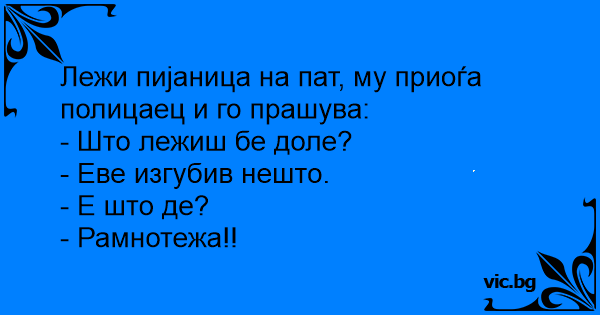 Лежи пијаница на пат, му приоѓа полицаец и го прашува:
