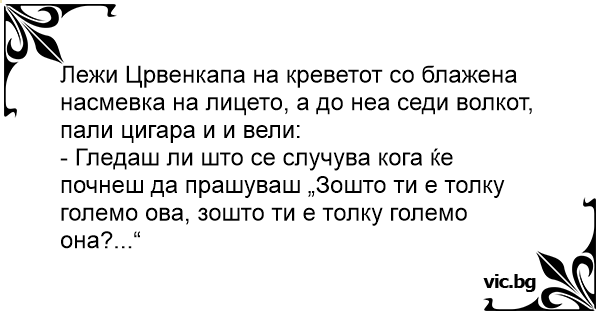 Лежи си червената шапцица с блаженна усмивка в леглото, а вълкът казва: