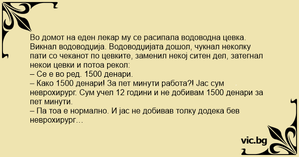 Викнал водоводџија. Водоводџијата дошол, чукнал неколку пати со чеканот по цевките, заменил некој ситен дел, затегнал некои цевки и потоа рекол: