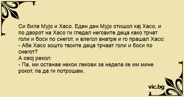 Си биле Мујо и Хасо. Еден ден Мујо отишол кај Хасо, и по дворот на Хасо ги гледал неговите деца како трчат голи и боси по снегот, и влегол внатре и го прашал Хасо:
