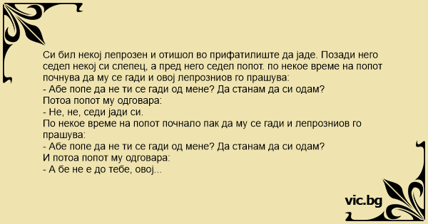 Си бил некој лепрозен и отишол во прифатилиште да јаде. Позади него седел некој си слепец, а пред него седел попот. по некое време на попот почнува да му се гади и овој лепрозниов го прашува: