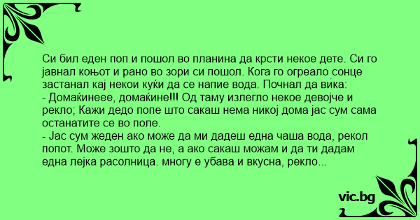 - Јас сум жеден ако може да ми дадеш една чаша вода, рекол попот. Може зошто да не, а ако сакаш можам и да ти дадам една лејка расолница. многу е убава и вкусна, рекло девојчето. Не е битно што ке ми дадеш само да се освежам, рекол попот. Девојчето му донело, попот се освежил и се заблагодарил и грижливо го прашал девојчето:
