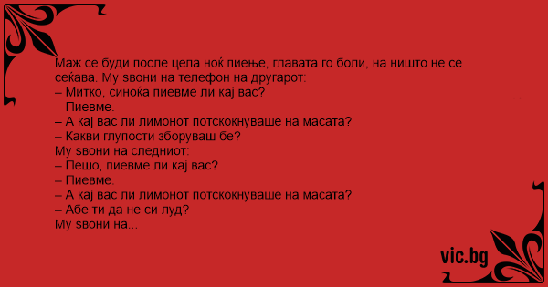- Ванка, как се нипихме вчера само. Малииии. Даже по едно време един лимон 'зе да бега по масата...