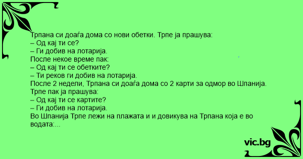 После 2 недели, Трпана си доаѓа дома со 2 карти за одмор во Шпанија. Трпе пак ја прашува: