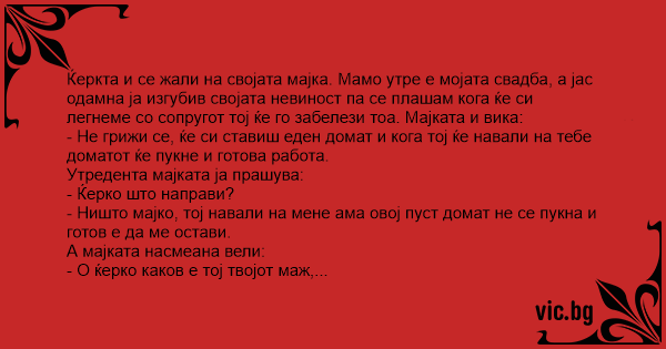 Ќеркта и се жали на својата мајка. Мамо утре е мојата свадба, а јас одамна ја изгубив својата невиност па се плашам кога ќе си легнеме со сопругот тој ќе го забелези тоа. Мајката и вика: