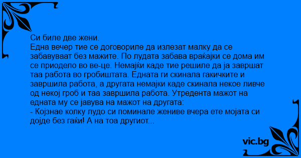 Една вечер тие се договориле да излезат малку да се забавуваат без мажите. По лудата забава враќајки се дома им се приодело во ве-це. Немајќи каде тие решиле да ја завршат таа работа во гробиштата. Едната ги скинала гакичките и завршила работа, а другата немајки каде скинала некое ливче од некој гроб и таа завршила работа. Утредента мажот на едната му се јавува на мажот на другата: