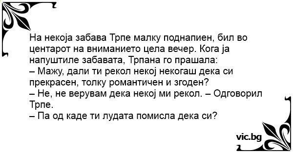 На некоја забава Трпе малку поднапиен, бил во центарот на вниманието цела вечер. Кога ја напуштиле забавата, Трпана го прашала: