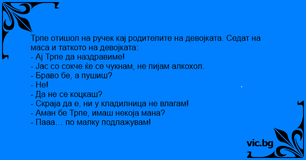 Трпе отишол на ручек кај родителите на девојката. Седат на маса и таткото на девојката: