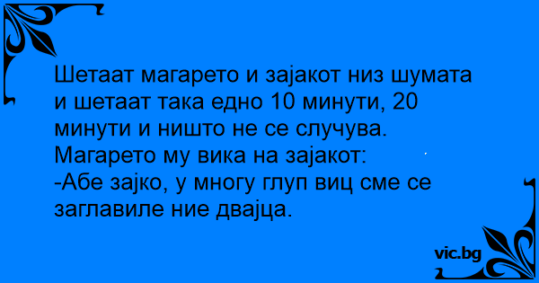 Шетаат магарето и зајакот низ шумата и шетаат така едно 10 минути, 20 минути и ништо не се случува. Магарето му вика на зајакот:
