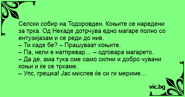 Селски собир на Тодоровден. Коњите се наредени за трка. Од Некаде дотрчува едно магаре полно со ентузијазам и се реди до нив.