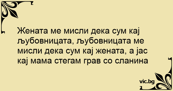 Жената ме мисли дека сум кај љубовницата, љубовницата ме мисли дека сум кај жената, а јас кај мама стегам грав со сланина