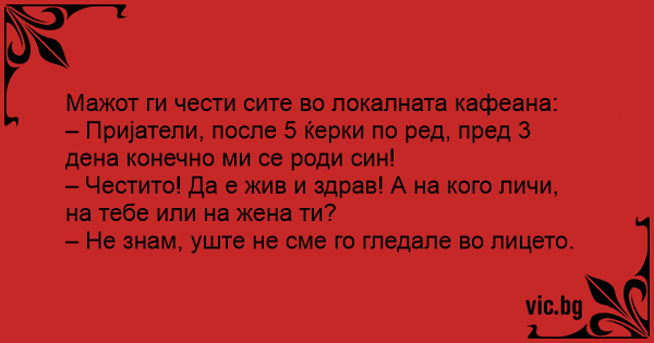 – Пријатели, после 5 ќерки по ред, пред 3 дена конечно ми се роди син!
