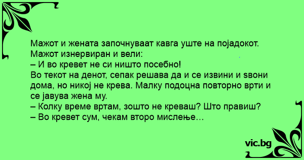 Мажот, лекар се кара со својата жена, домаќинка за време на појадокот, бесен бега од масата и вели: - И да знаеш, воопшто не си добра во кревет! На работа сваќа дека претерал и дека треба да се...