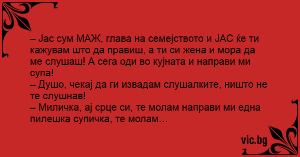 – Јас сум МАЖ, глава на семејството и ЈАС ќе ти кажувам што да правиш, а ти си жена и мора да ме слушаш! А сега оди во кујната и направи ми супа!
