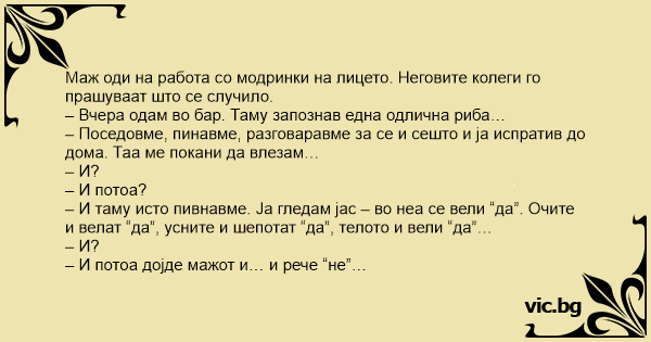 – Вчера одам во бар. Таму запознав една одлична риба…