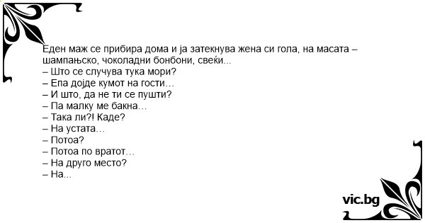 Еден маж се прибира дома и ја затекнува жена си гола, на масата – шампањско, чоколадни бонбони, свеќи...