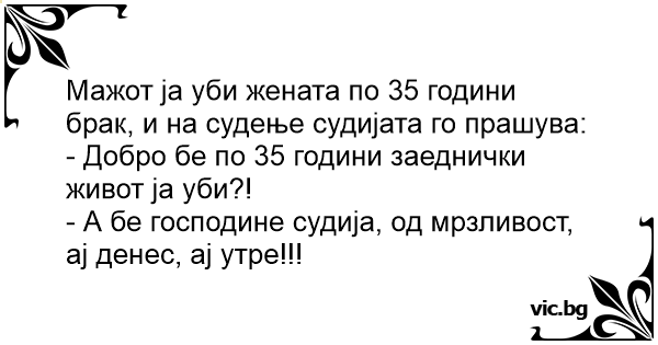 Ubio Crnogorac ženu poslije 35 godina braka. Na suđenju pita ga sudija: - Pa dobro, što ste to uradili baš sada nakon toliko godina? - Ma lijenost, gospodine sudija. Sve danas ću, sutra ću...
