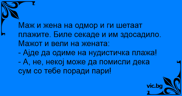 Маж и жена на одмор и ги шетаат плажите. Биле секаде и им здосадило.