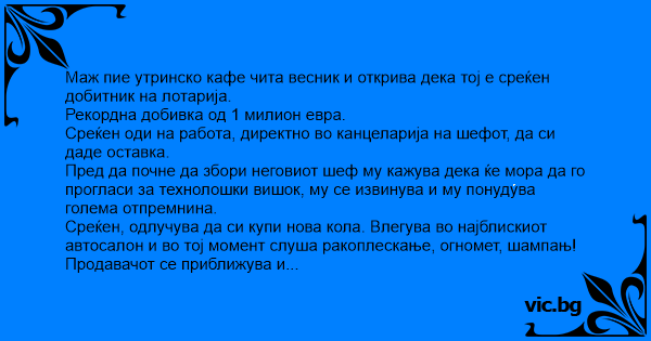 Маж пие утринско кафе чита весник и открива дека тој е среќен добитник на лотарија.
