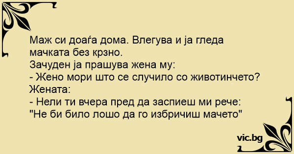 Маж си доаѓа дома. Влегува и ја гледа мачката без крзно.