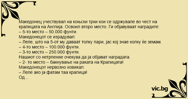 Македонец учествувал на коњски трки кои се одржувале во чест на кралицата на Англија. Освоил второ место. Ги објавуваат наградите: