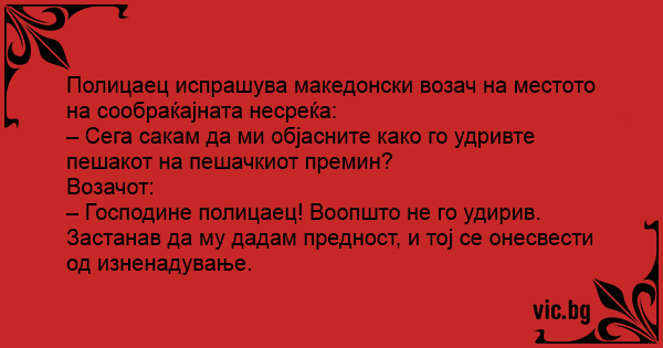 – Господине полицаец! Воопшто не го удирив. Застанав да му дадам предност, и тој се онесвести од изненадување.