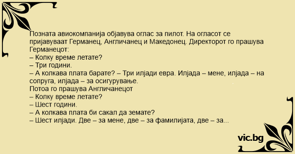 – А колкава плата барате? – Три илјади евра. Илјада – мене, илјада – на сопруга, илјада – за осигурување.