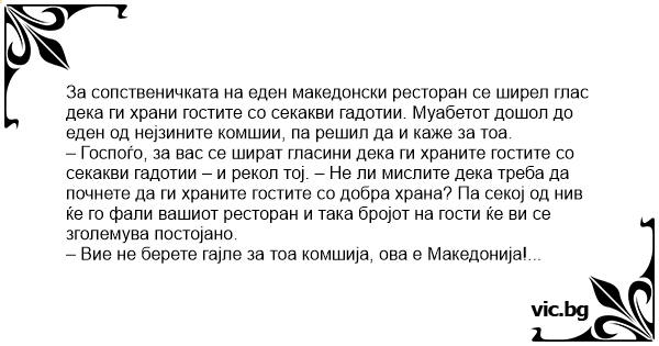 За сопственичката на еден македонски ресторан се ширел глас дека ги храни гостите со секакви гадотии. Муабетот дошол до еден од нејзините комшии, па решил да и каже за тоа.