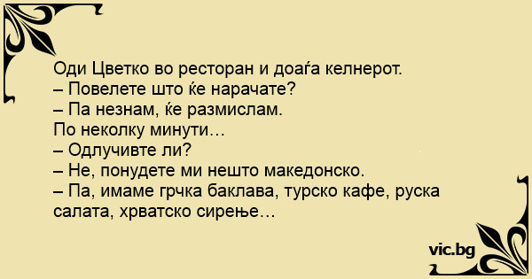 Оди Цветко во ресторан и доаѓа келнерот.